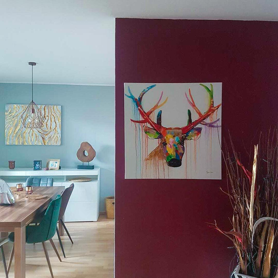 Gebannt blickt der König des Waldes in Ihre Augen und fordert Sie auf, ihm in eine Welt voller Farben und Träume zu folgen. Durch die Verarbeitung von Pinseln in dem Ölbild 'Zum bunten Hirschen' entsteht ein einzigartiger 3D-Effekt. Machen Sie Ihren Lieben eine Freude und verwandeln das Kinderzimmer in einen Ort der Phantasie. Ihr handgemaltes Gemälde erhalten Sie in der Größe 80x80cm. Anders als bei minderwertigen Drucken auf Leinwand können Sie auf unseren Unikaten jeden Pinselstrich fühlen. 0 Oil painting 1 Ölgemälde Handmade Quality 2 2 0